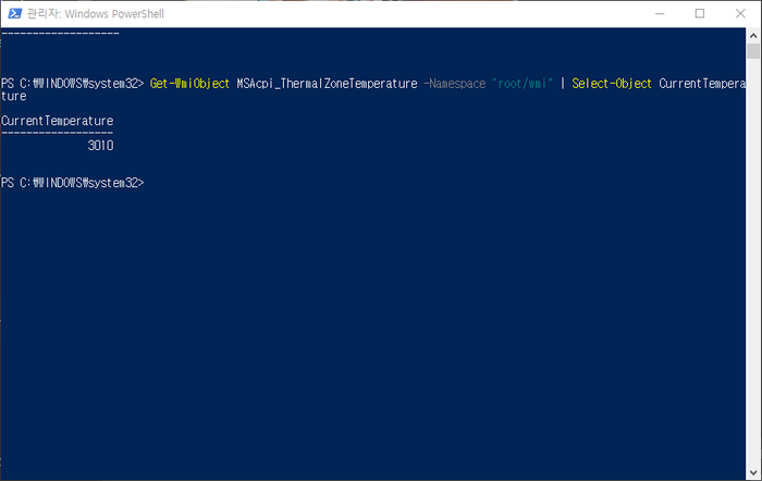 Get-WmiObject MSAcpi_ThermalZoneTemperature -Namespace "root/wmi" | Select-Object CurrentTemperature를 입력하고 엔터를 눌러요. - 온도 확인: 명령 프롬프트와 동일하게 섭씨 온도로 변환해야 해요.