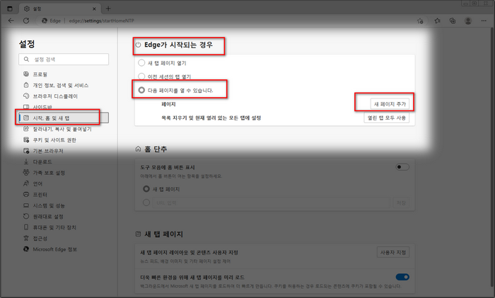 최신 버전 엣지 시작 페이지 설정 방법