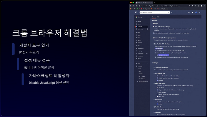 설정 메뉴에서 아래로 스크롤 하다 보면 `Debugger` 섹션을 찾을 수 있어요. 그곳에 있는 `Disable JavaScript`라는 옵션을 선택합니다. 이걸 선택하면 현재 페이지에서 자바스크립트가 비활성화되어, 결국 마우스 우클릭이 가능해지는 거죠! 이렇게 간단한 방법으로 원하는 정보를 얻을 수 있으니, 반드시 기억해 두세요.