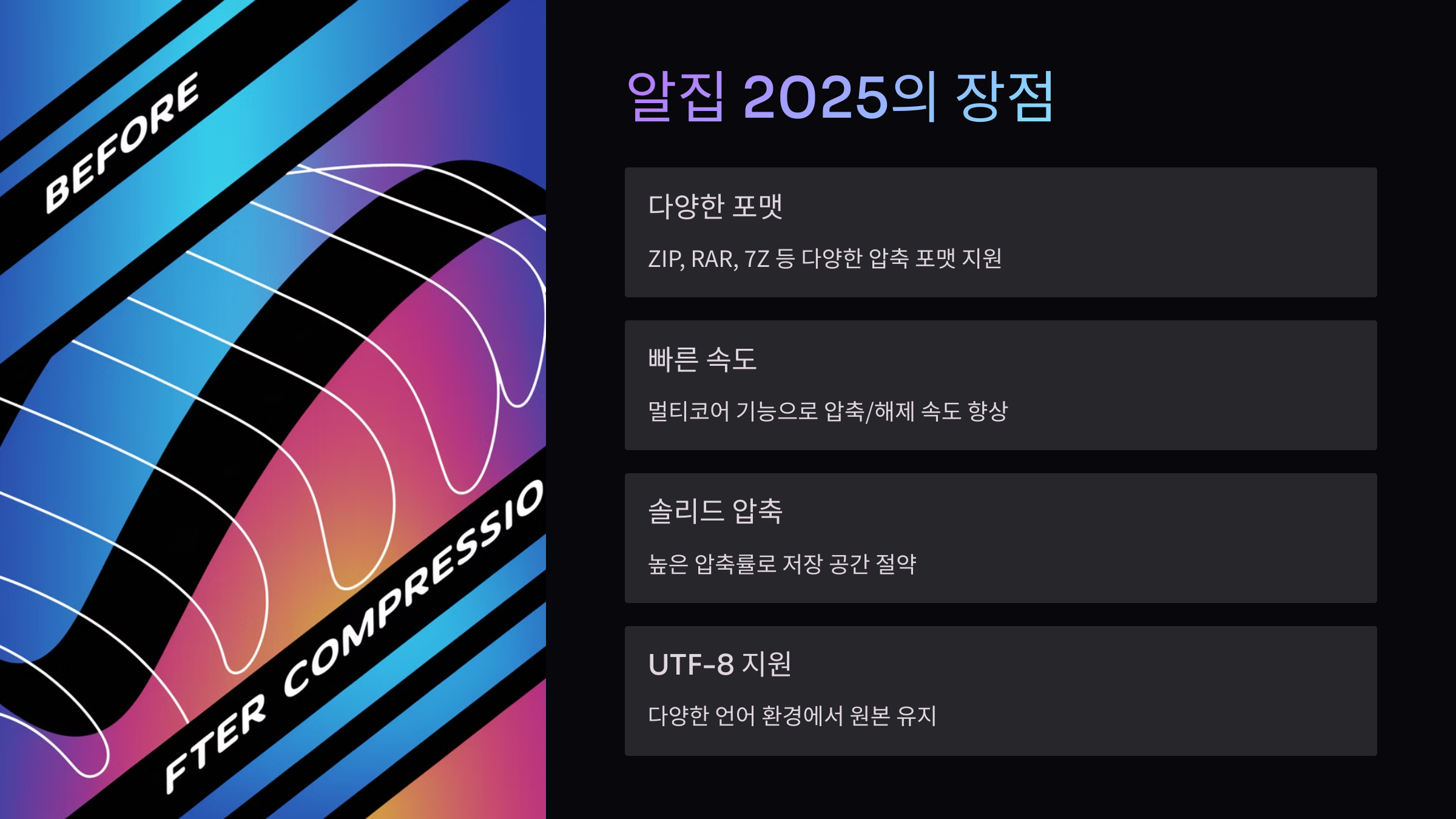 알집 다운로드 2025는 편리한 기능이 가득하다는 점에서 많은 사랑을 받고 있어요. 다양한 압축 포맷을 지원하는 건 물론, 빠른 압축과 해제 속도도 큰 장점이에요. 특히 파일 관리에 도움이 되는 멀티코어 기능과 솔리드 압축 덕분에, 여러 파일을 다룰 때 한층 수월해진 기분이죠. 그리고 UTF-8 유니코드 압축도 지원해서 여러 언어 환경에서도 파일의 원본이 유지된다는 부분은 아주 실용적이에요.