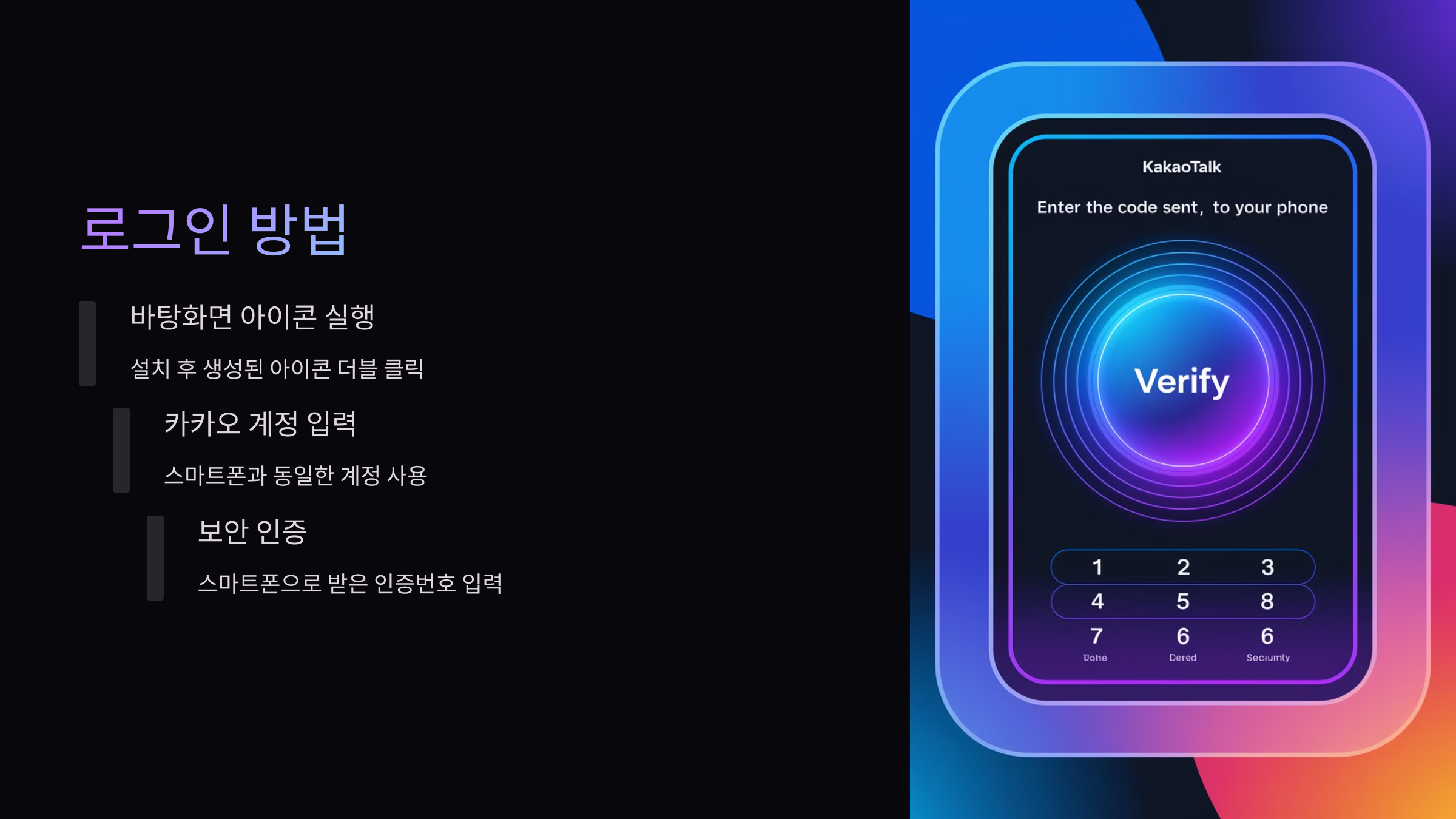 설치가 다 끝났다면 바탕화면에 카카오톡 아이콘이 생길 거예요. 그 아이콘을 더블 클릭해 프로그램을 실행하고, 스마트폰에서 쓰는 카카오 계정으로 로그인해보세요. 보안 인증 단계가 있는데, 이때 스마트폰에 오는 인증번호를 확인하고 입력하면 로그인이 완료돼요.