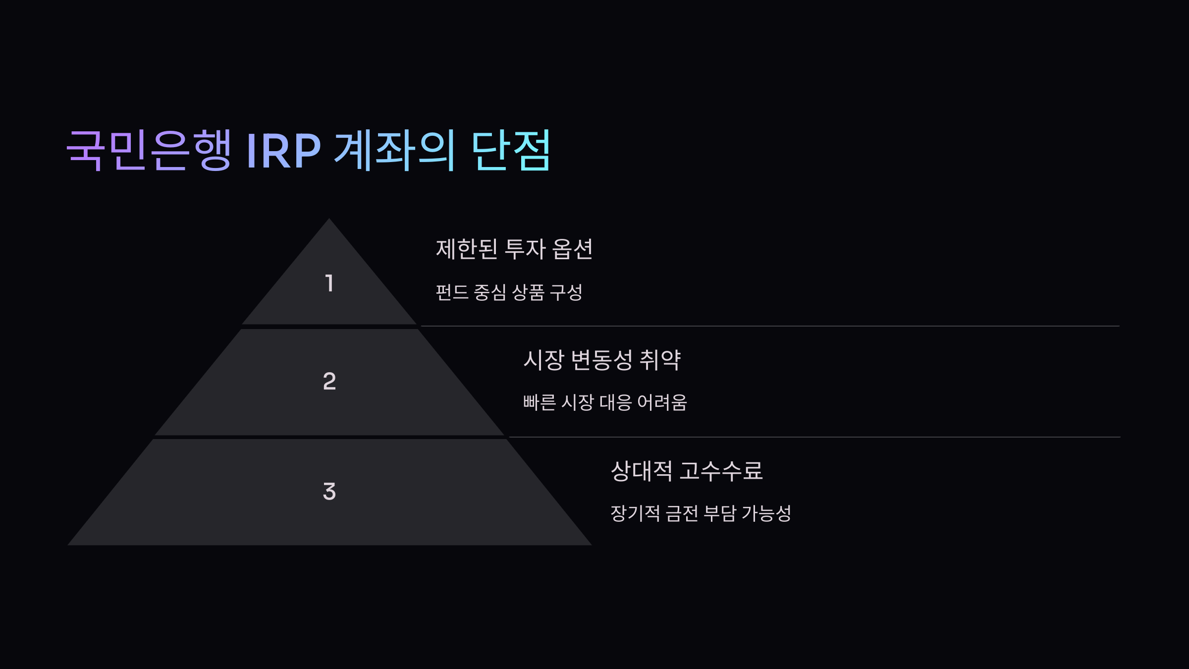 물론, 국민은행 IRP 계좌는 장점이 많지만 한계도 분명해요. 다른 금융 상품에 비해서 펀드 중심으로 이루어져 있어서, 말 그대로 마켓의 변동성에 휘둘리기 쉽고 시장 상황에 따라 수익을 빨리 올리기가 어렵죠. 그리고 수수료도 상대적으로 높을 수 있어, 장기적으로 놓고 보면 금전적으로 부담이 될 수 있어요. 그래서 더 다양한 투자처를 찾고자 한다면 증권사로의 이전도 고려해볼 만해요.