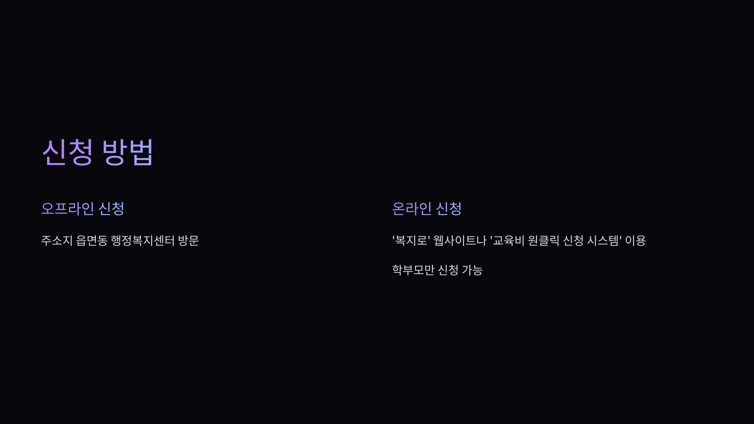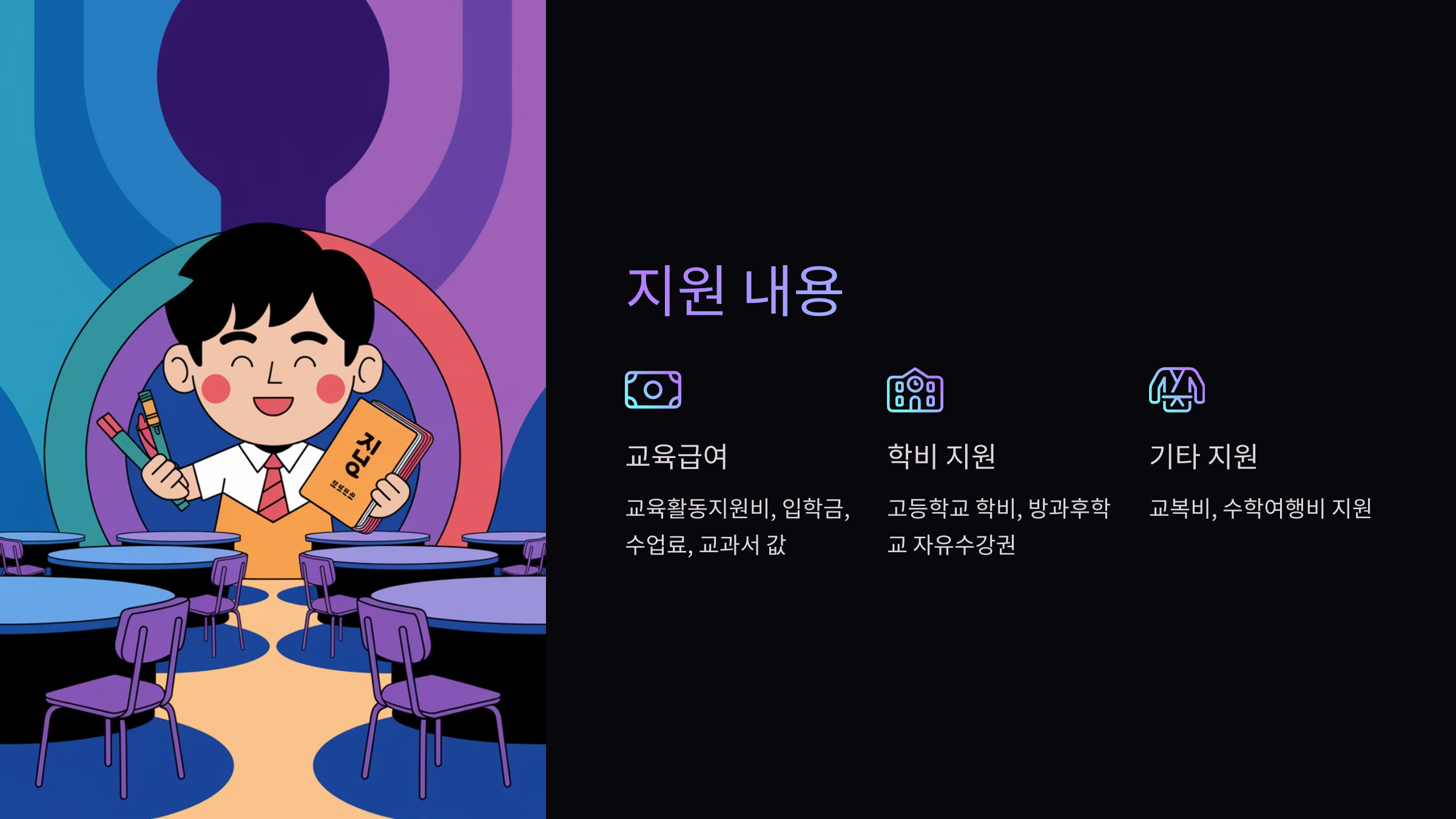 * 교육급여: 이건 기초생활수급자 가정 자녀를 위한 지원이에요. * 교육비 지원: 중위소득 50% 이하, 또는 80% 이하 가구의 학생들에게 주어집니다.