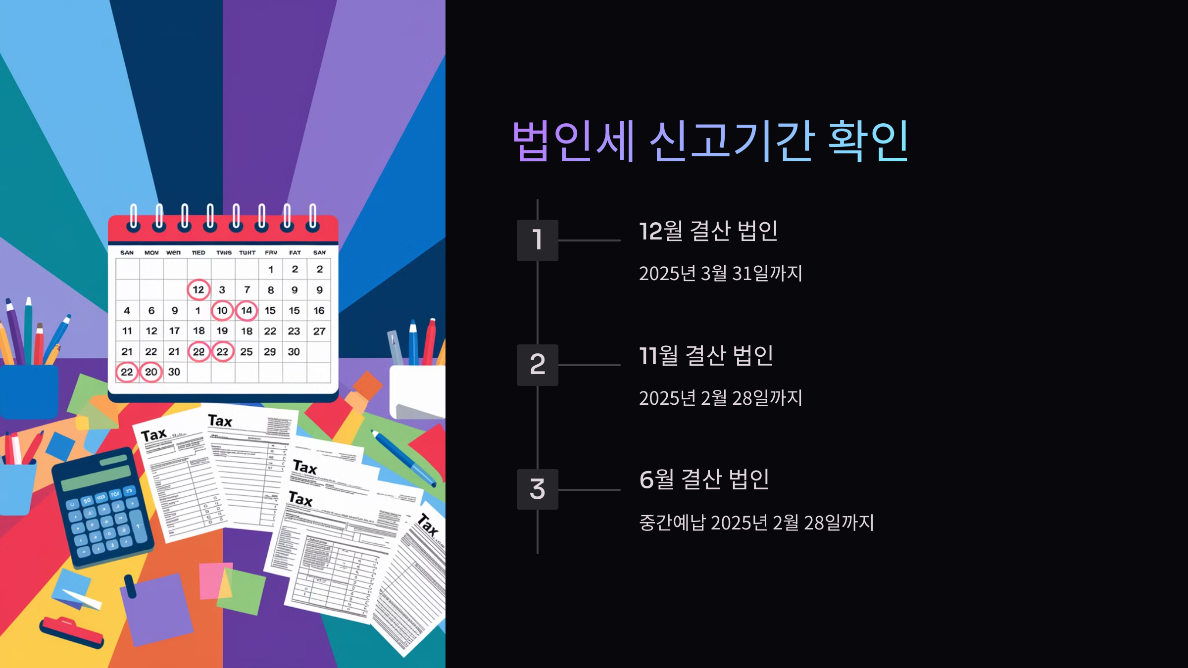 3월 31일! 그리고 11월에 결산하는 법인은 조금 더 서둘러야 해요. 2025년 2월 28일까지 신고와 납부를 마쳐야 하거든요. 달력을 크게 보고 동그라미 쳐 놔야겠죠?