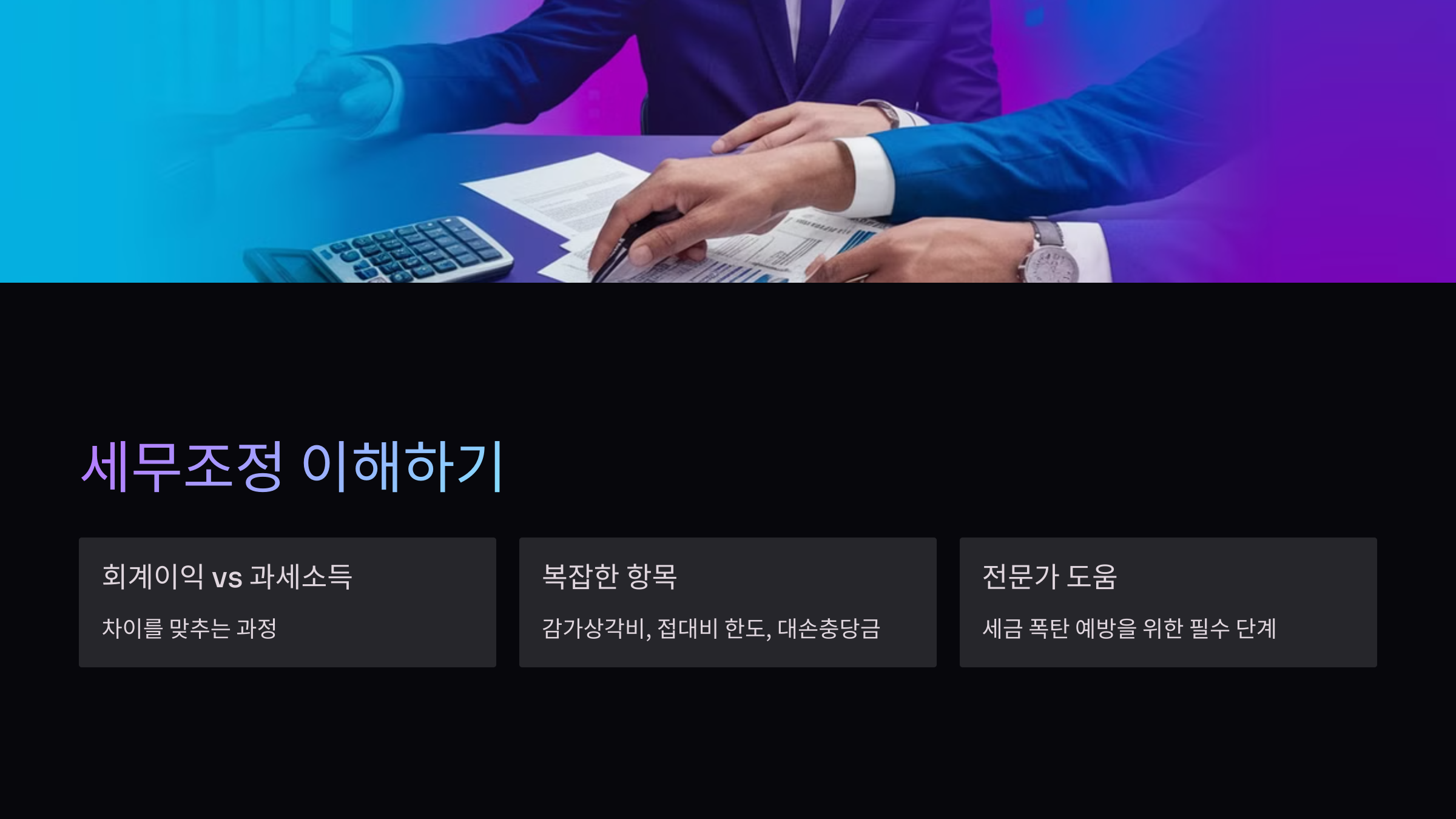 어… 세무조정이라는 건, 회계상 이익이랑 세법상 과세소득이 좀 다를 수 있거든요. 이 차이를 맞춰주는 과정이라고 생각하면 돼요. 감가상각비, 접대비 한도, 대손충당금… 이런 복잡한 항목들이 있어서, 솔직히 전문가 도움을 받는 게 제일 속 편해요. 괜히 혼자 끙끙 앓다가 세금 폭탄 맞을 수도 있으니까요.