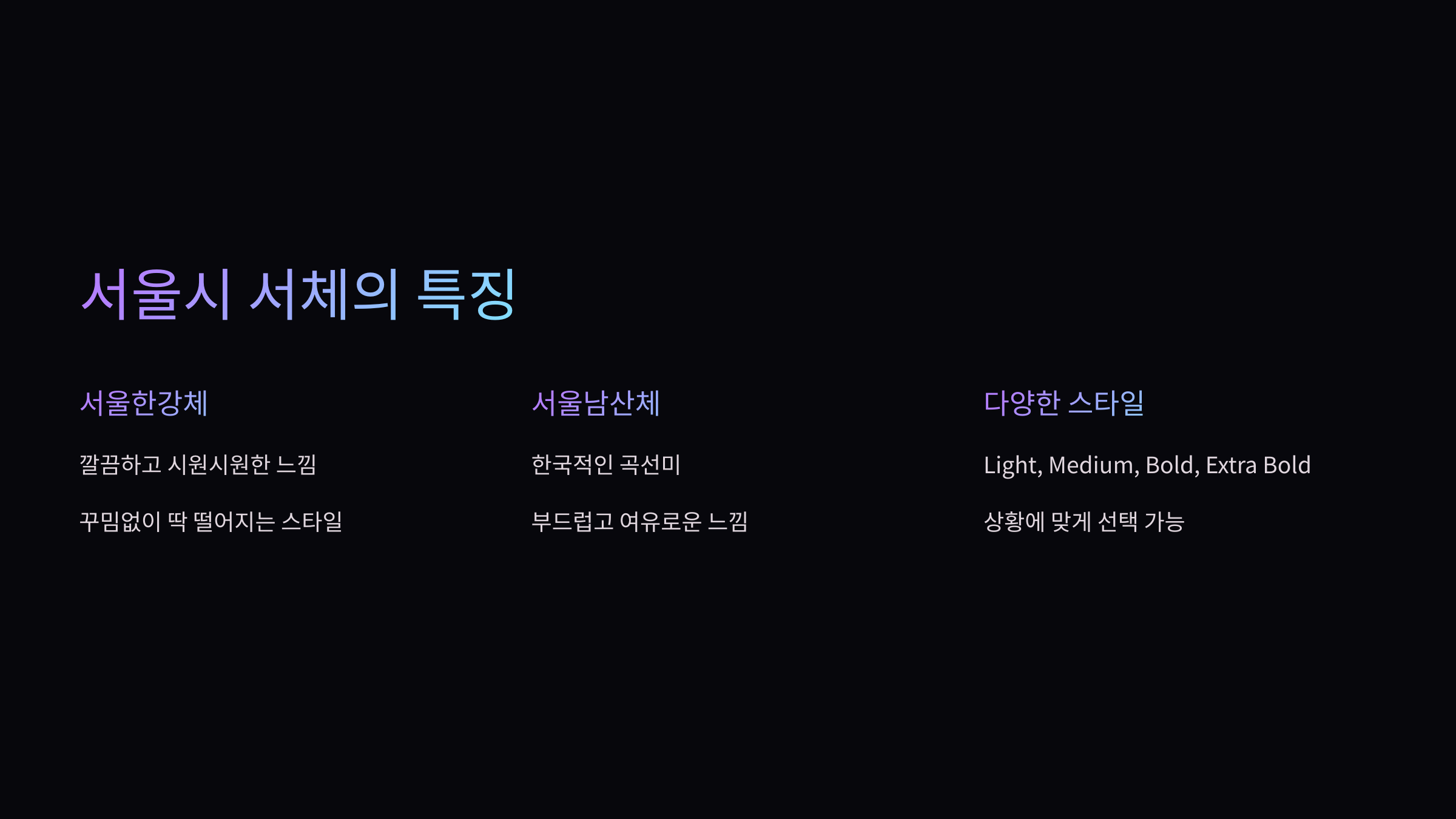 반면에 서울남산체는 한국적인 곡선미를 살려서, 좀 더 부드럽고 여유로운 느낌을 준다고 할까요? 신기하게도 이 두 서체가 Light, Medium, Bold, Extra Bold 이렇게 다양한 스타일로 나와서, 우리가 필요할 때 딱 맞는 스타일을 골라 쓸 수 있어요.