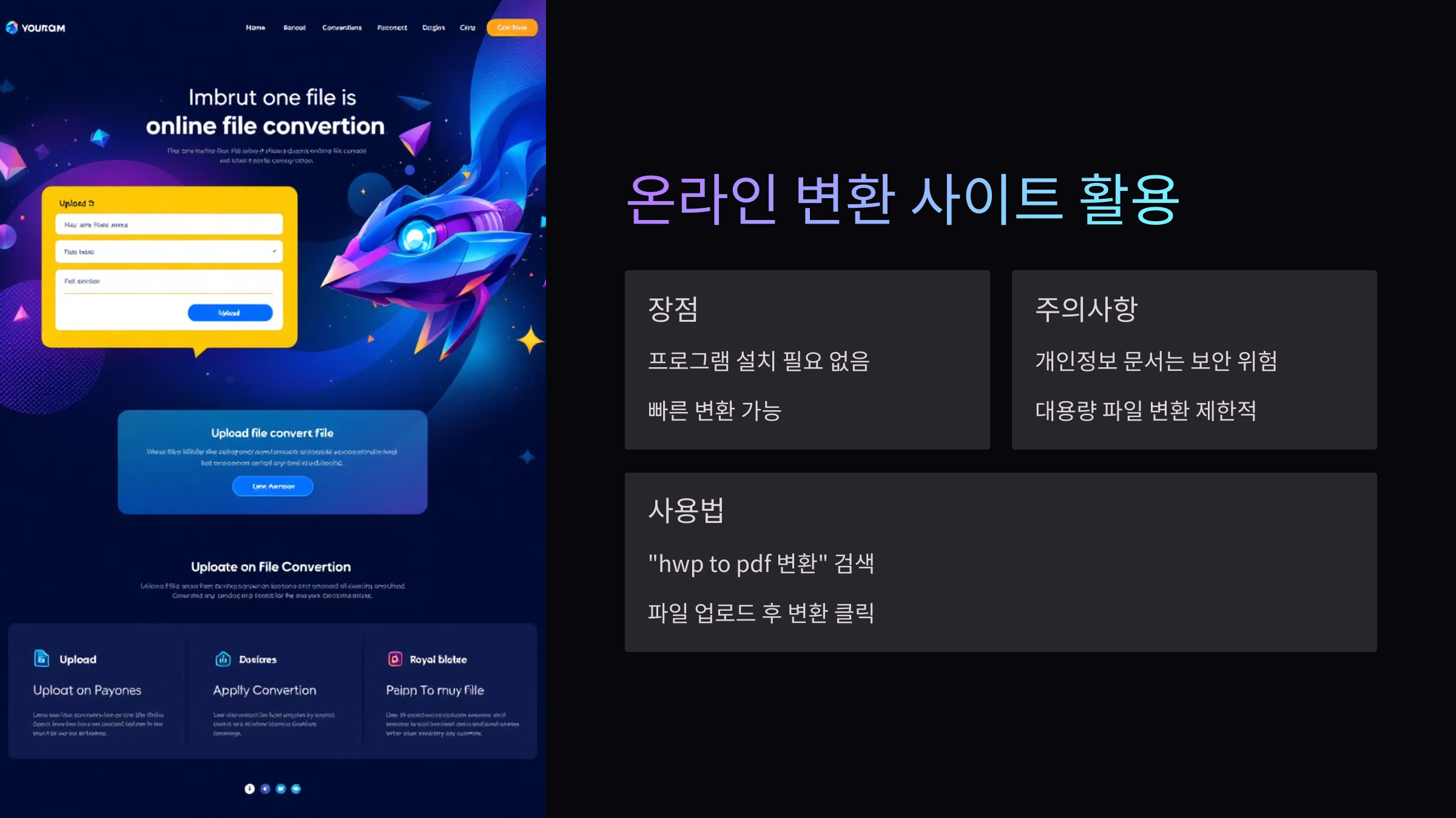 이 사이트들은 보통 파일을 업로드하면 바로 PDF 파일로 변환해주는 편리함을 제공하죠. 하지만! 여기서 주의해야 할 점이 있어요. 혹시 개인 정보가 담긴 중요한 문서라면, 온라인 변환 사이트는 조금 조심스러울 수 있다는 거예요. 왜냐하면 파일을 사이트에 업로드하는 과정에서 보안 문제가 발생할 수도 있거든요. 그리고 파일 용량이 너무 크면 변환이 안 되거나, 시간이 오래 걸릴 수도 있고요. 그래서 급할 때 잠깐 사용하는 건 괜찮지만, 중요한 문서는 좀 더 안전한 방법을 사용하는 게 좋겠죠?