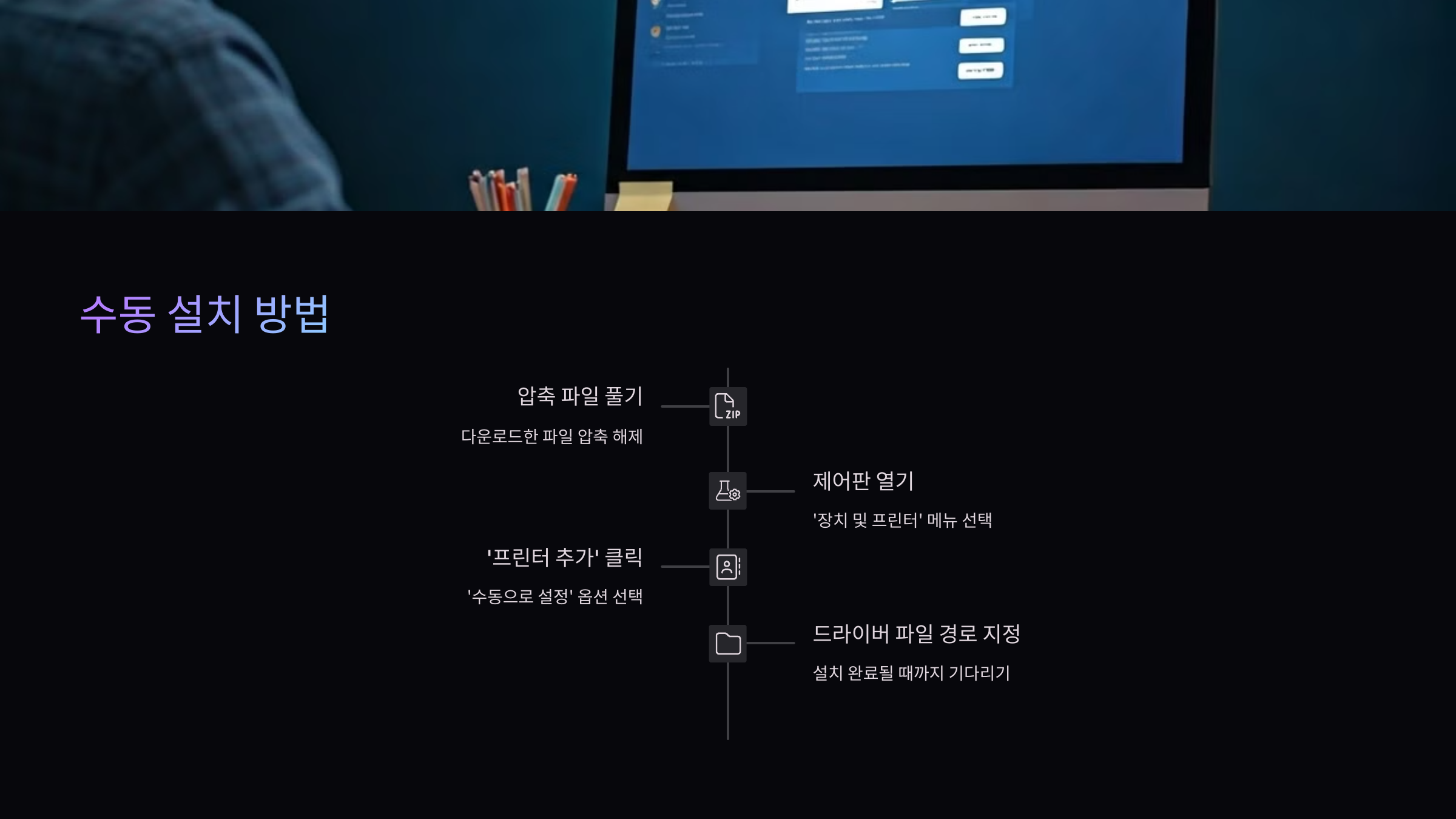 - 거기서 '프린터 추가' 버튼을 누르고, '수동으로 설정' 또는 '디스크 있음' 같은 옵션을 선택해서, 압축을 풀어놓은 드라이버 파일 경로를 지정해주면 돼요.
