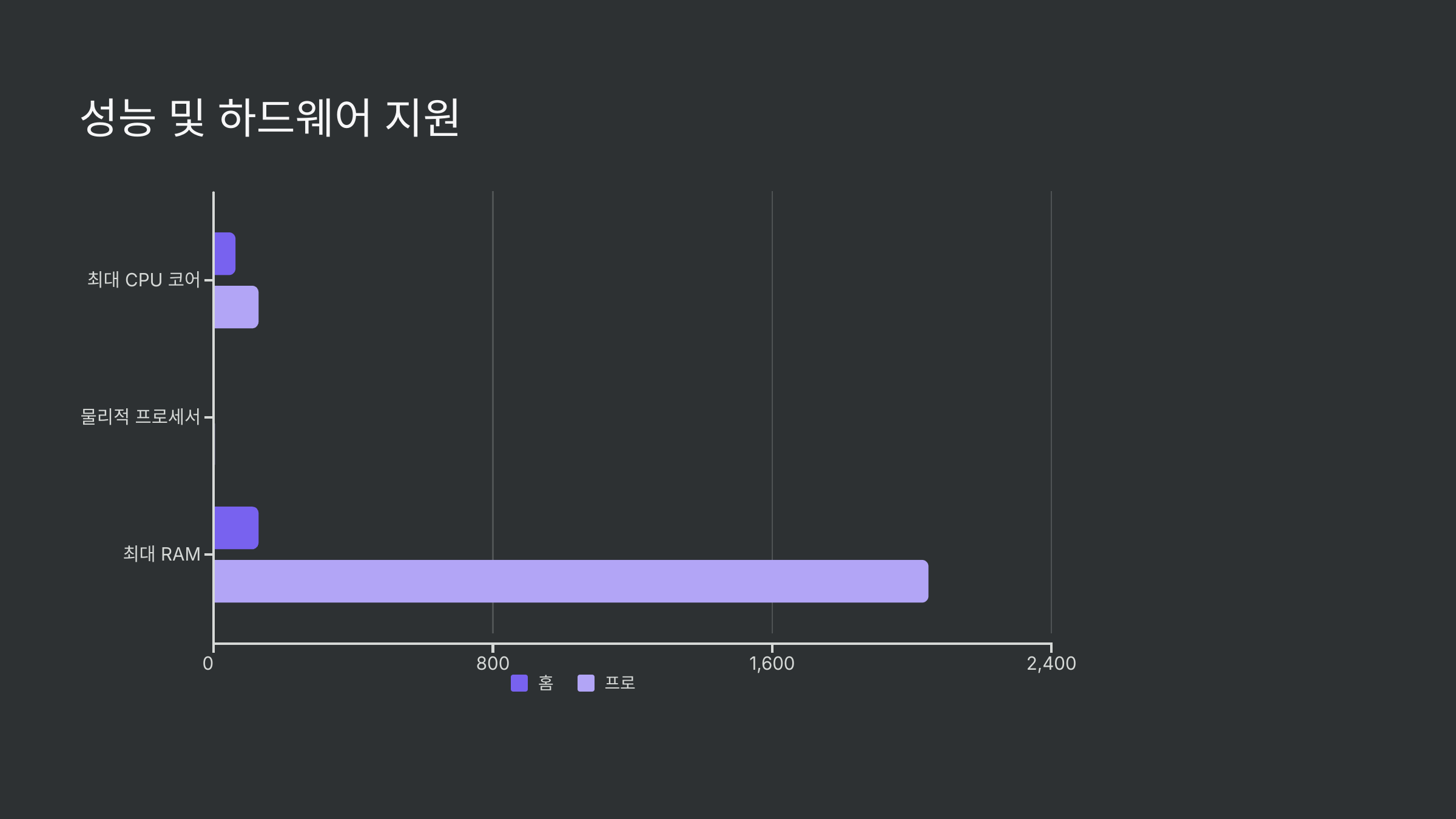 음, 사실 홈과 프로 에디션 자체의 '체감 성능' 차이는 거의 없다고 봐도 무방해요. 똑같은 하드웨어라면 프로그램을 실행하거나 게임을 할 때 속도 차이를 느끼긴 어렵죠. 성능 차이라고 이야기하는 부분은 주로 지원하는 하드웨어의 최대치를 말해요.