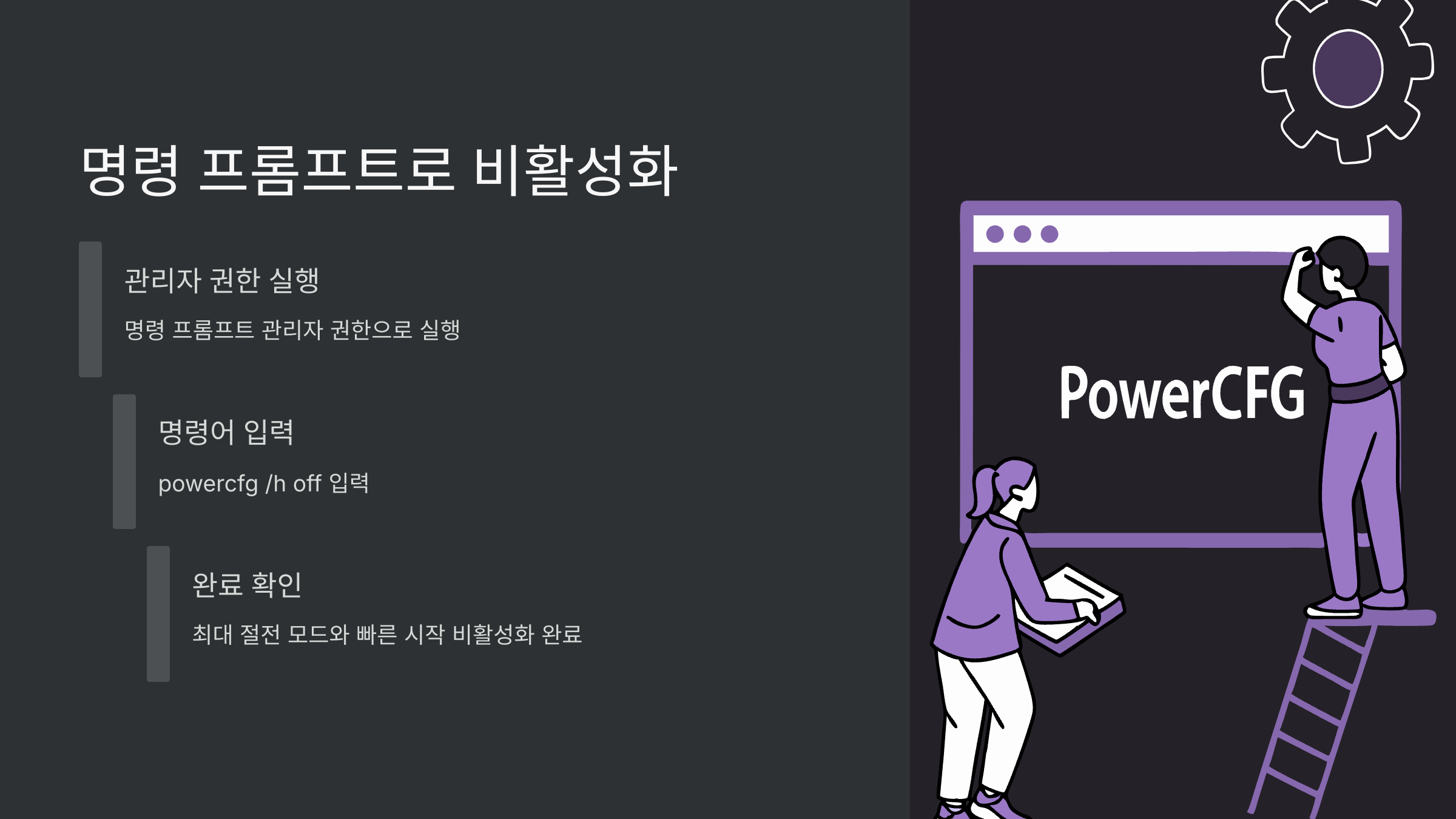 명령 프롬프트를 사용하여 윈도우 11 빠른 시작 기능을 비활성화하는 방법도 있습니다. 먼저 관리자 권한으로 명령 프롬프트를 실행해야 합니다. 그 다음 powercfg /h off 명령어를 입력하고 Enter 키를 누르시면 됩니다. 이 명령어는 컴퓨터의 최대 절전 모드를 비활성화하여 결과적으로 빠른 시작 기능까지 함께 비활성화하게 됩니다.