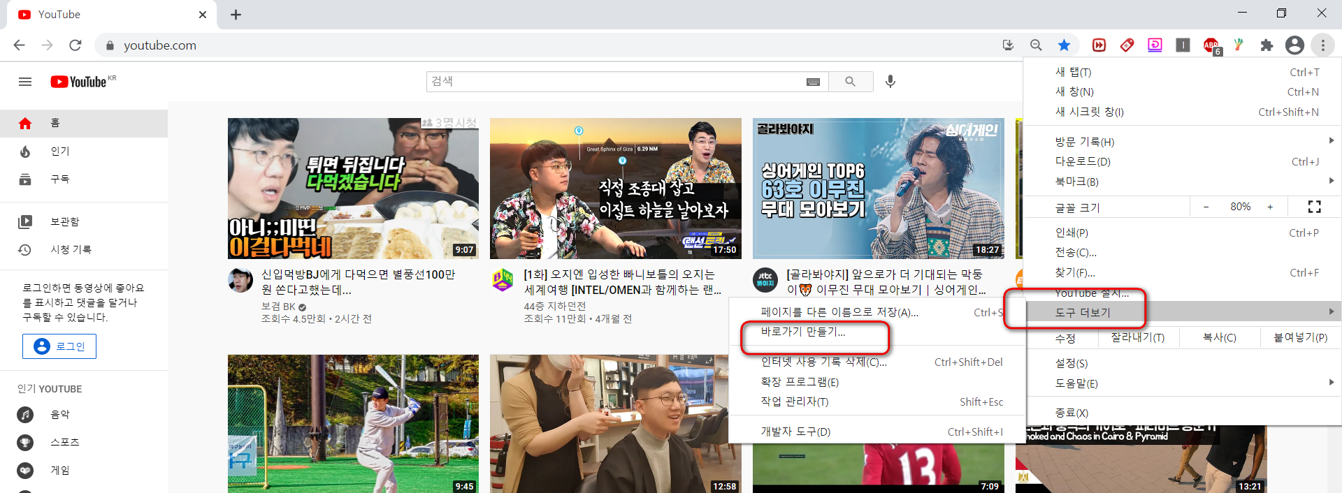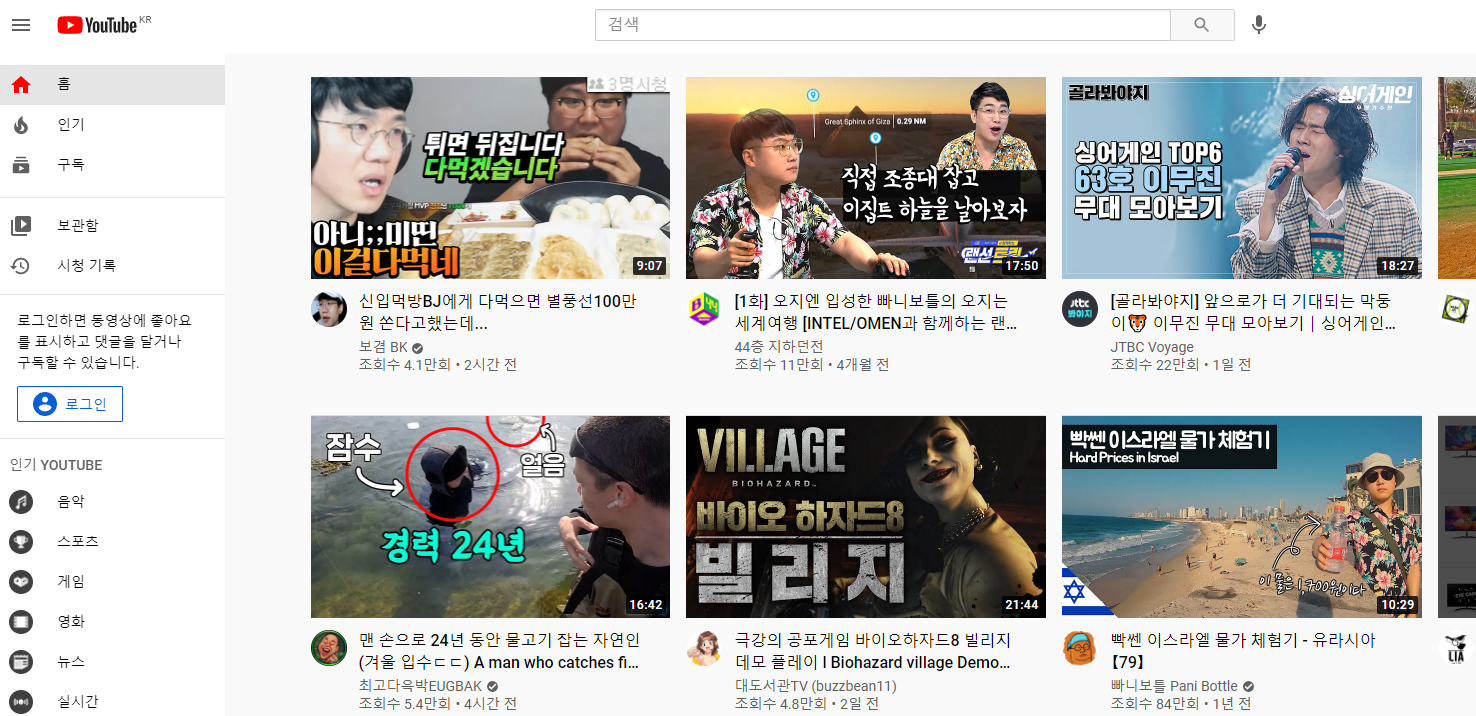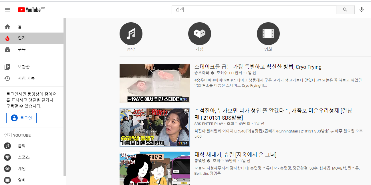 요즘에는 유튜브 바로가기를 만들어두고 알고리즘이 추천해주는 영상을 보는 분들보다는 인기라고 쓰여진 것을 더욱 선호하는것같아요. 이것은 편견없이 사람들이 많이 시청하는것을 찾아볼수 있으니 말이죠. 근데 재밌는 사실은 현재 제가 보는 1위는 음식굽는 방법이죠?