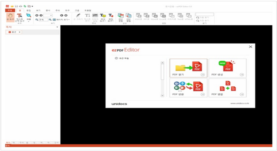 처음으로 ezPDF Editor 3.0을 실행하시면 아래와 같은 화면이 등장합니다. 첫화면에서 PDF열기, PDF 변환, PDF병합과 같은 기능을 선택하고 사용할 수 있습니다.