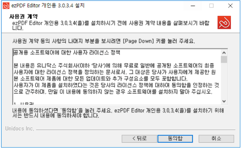 ezPDF Editor 3.0사용권 계약입니다. 당연히 라이선스 정책에 동의하셔야만 프로그램을 설치할 수 있습니다. 다시 말씀드리지만 기업, 단체등에서는 라이선스 구매후 사용할 수있습니다. 꼭 사용권 계약 내용을 확인해주세요.