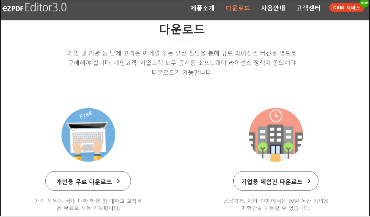 우선 ezPDF Editor 3.0 다운로드를 받기 전에 가장 중요한 라이선스를 확인해보세요. 무료로 이용이 가능한 대상은 위에설명한 분들과 비영리 개인사용자만 무료로 이용할 수 있습니다. 기업, 공공기관등과 같은 단체에서는 유료 라이선스를 구매하셔야 이용이 가능하죠.