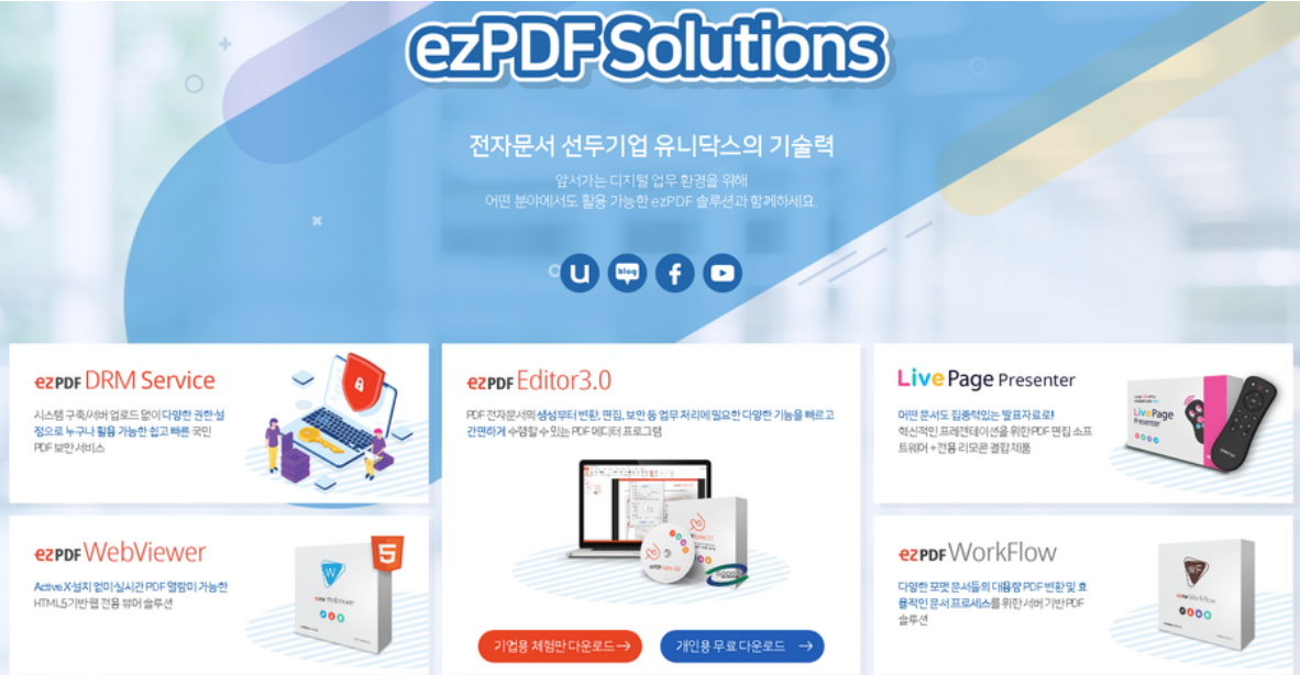 여러분이 찾는 ezPDF Editor 3.0 다운로드는 어디에서 찾아볼 수 있는지 알아볼까요? 당연한 소리이기는 하지만 공식 홈페이지를 통해서 받는 것이 가장 좋습니다. 일단 안전하고 정확하기 때문이죠. 공식 홈페이지주소는 검색사이트에서 확인할 수 있습니다. 우선 사이트에 접속하시면 몇가지 솔루션과 함께 우리가 원하는 항목을 찾을 수 있습니다.