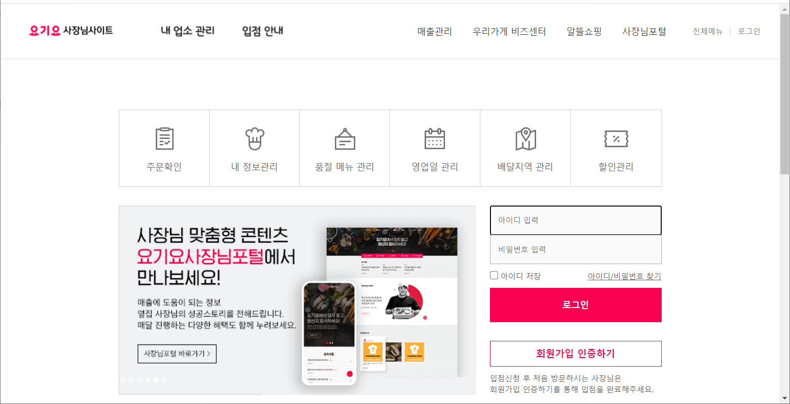 일단 중요한것은 요기요사장님사이트에서 자신의 업소관리를 해주셔야 한다는것입니다. 주문확인이나 품절관리등등 할께 참으로 많아요.