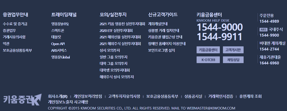 일단 키움증권 공식 홈페이지에 들어가시면 쉽게 찾을수 있을줄 알았는데 어렵더군요. 상단부분에서는 고객센터라는 부분을 알아보기 힘들었는데요. 이유는 홈페이지 위쪽이 아니고 하단부분에 있어서 그랬더군요.