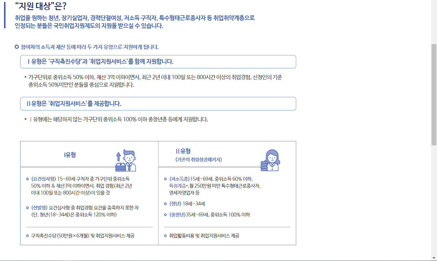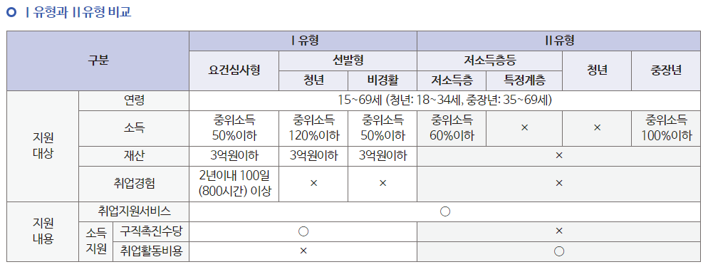 해당 두가지 유형 같은 경우에는 재산과 소득, 연령, 취업 경험에따라서 달라지게 되고 지원되는 내용도 다르다고 하니 이부분은 꼭 미리 보셔야 합니다.