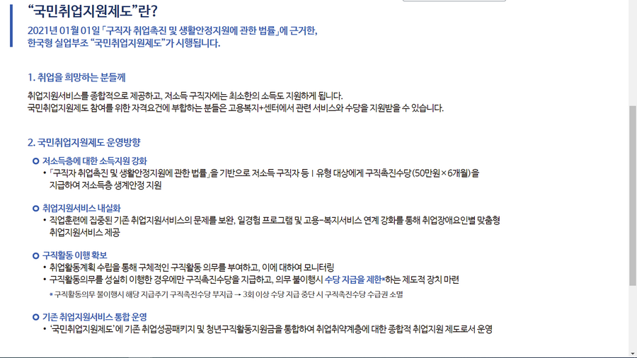 2021년 1월 1일을 기준으로 새롭게 등장한것이 한국형 실업부조라고 하는 "국민취업지원제도"라고 하는것인데요. 이것을 통해서취업의 문제로 어려움을 격고 있는 분들을 정부가 지원을 한다고 합니다. 그내용은 직접 확인해보시는 것이좋겠죠.