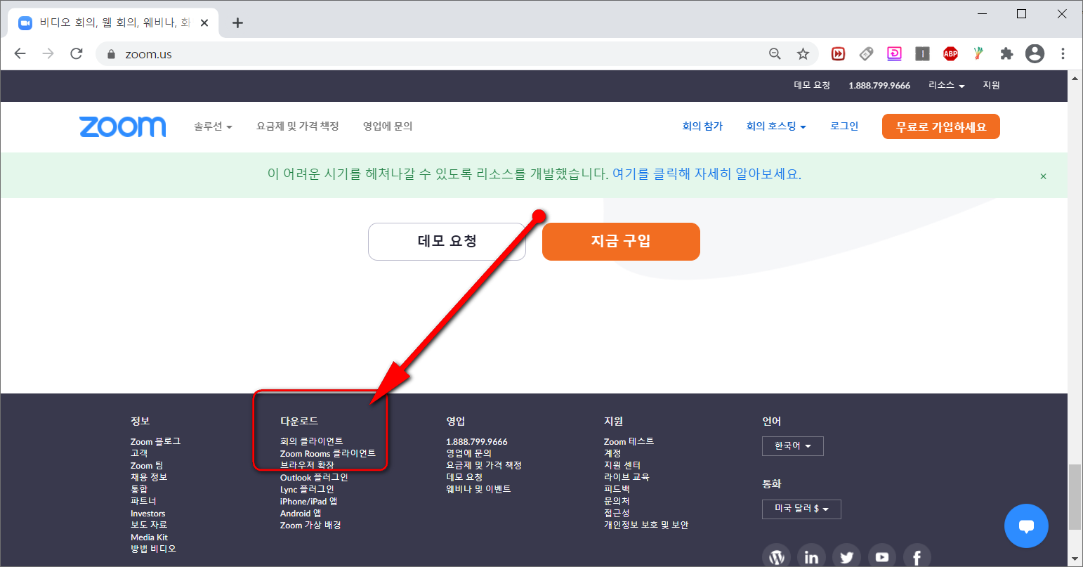 일단 클라이언트 프로그램을 다운로드 받기위해서는 zoom 공식 홈페이지를 찾아서 접속하셔야합니다. zoom.us 라는 주소를 사용하고 있는데 거기에서 웹페이지 하단을 보시면 "다운로드->회의 클라이언트"를 골라주시면 됩니다.