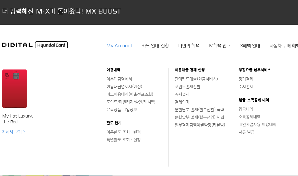 회원가입을 하시고 이용하신 내역을 확인해보실수 있는데요. 기본적으로 로그인을 하시고 사이트 위에 있는 My Account라는 메뉴를 찾아보시면 거기에 이용내역, 대금명세서, 한도조회, 즉시결제등등을 알아볼수 있죠.