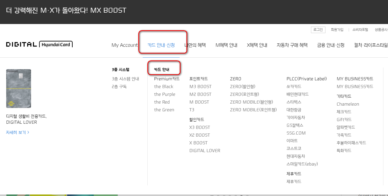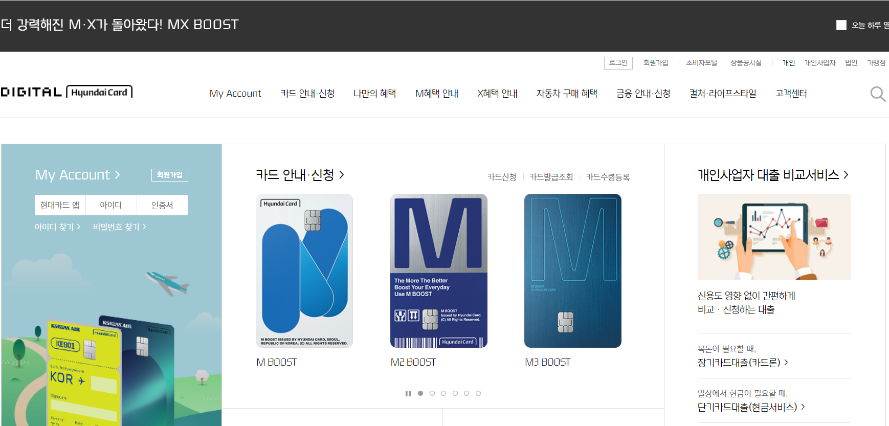 보통 현대카드 홈페이지를 찾는분들은 2분류로 나누어지게됩니다. 이미 가입을 해서 회원이신분들이 있고 아직 만들지 않아서 개설을 원하는 분들이 있겠죠. 이들이 원하는 정보들은 이곳에 모여있습니다.