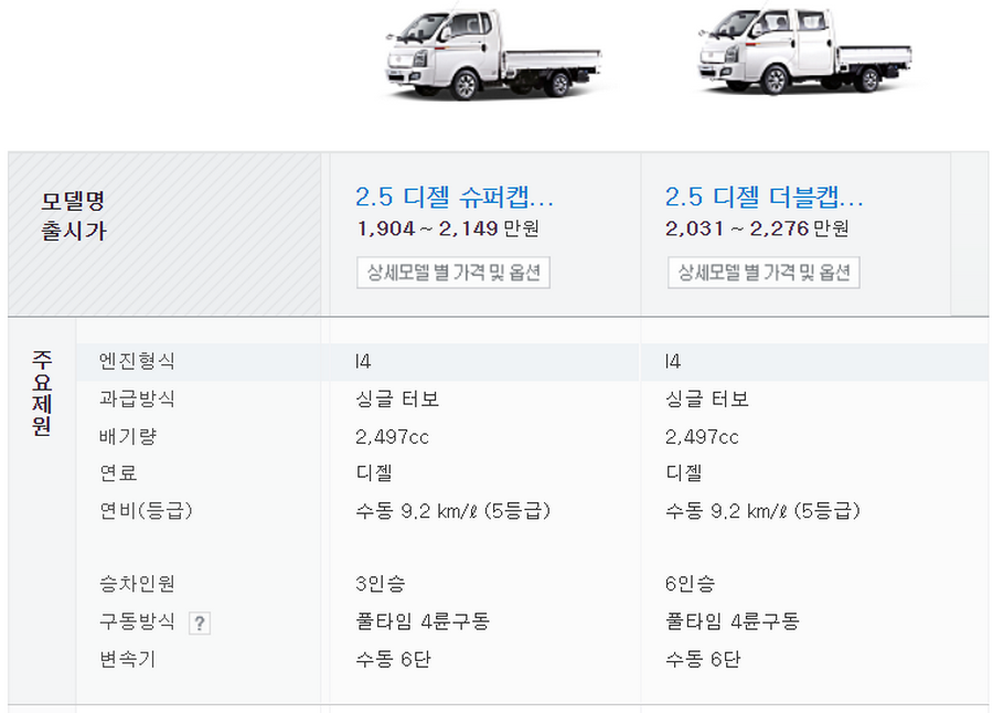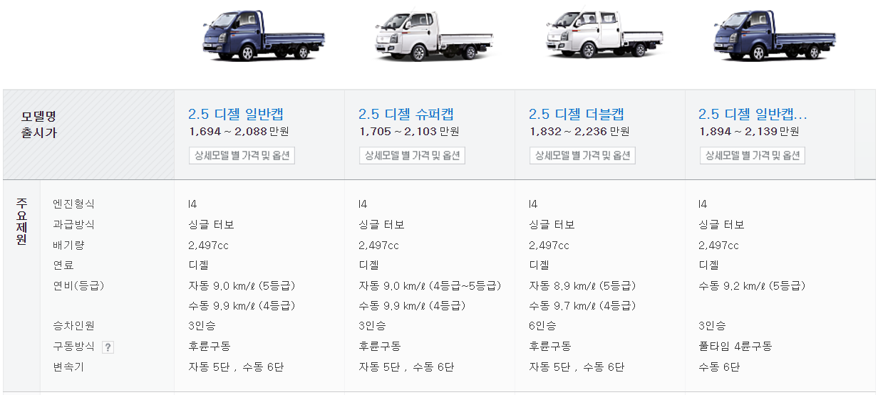 2.5 디젤 슈퍼캡 : 1,705~2,103만원