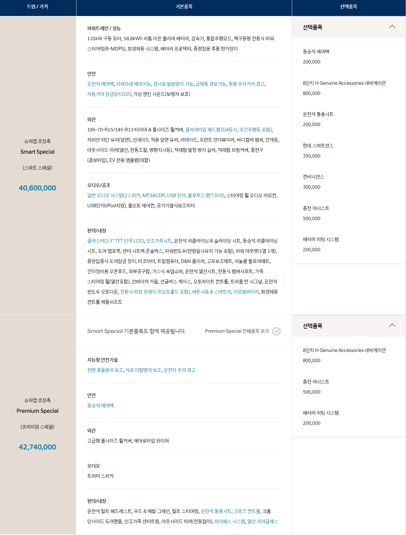 전기차 포터2 신차가격은 4060만원과 4274만원 두가지 모델로 나눠져 있습니다. 중요한것은 선택품목이라고 해서 옵션에 따라서 추가되어질수 있습니다.
