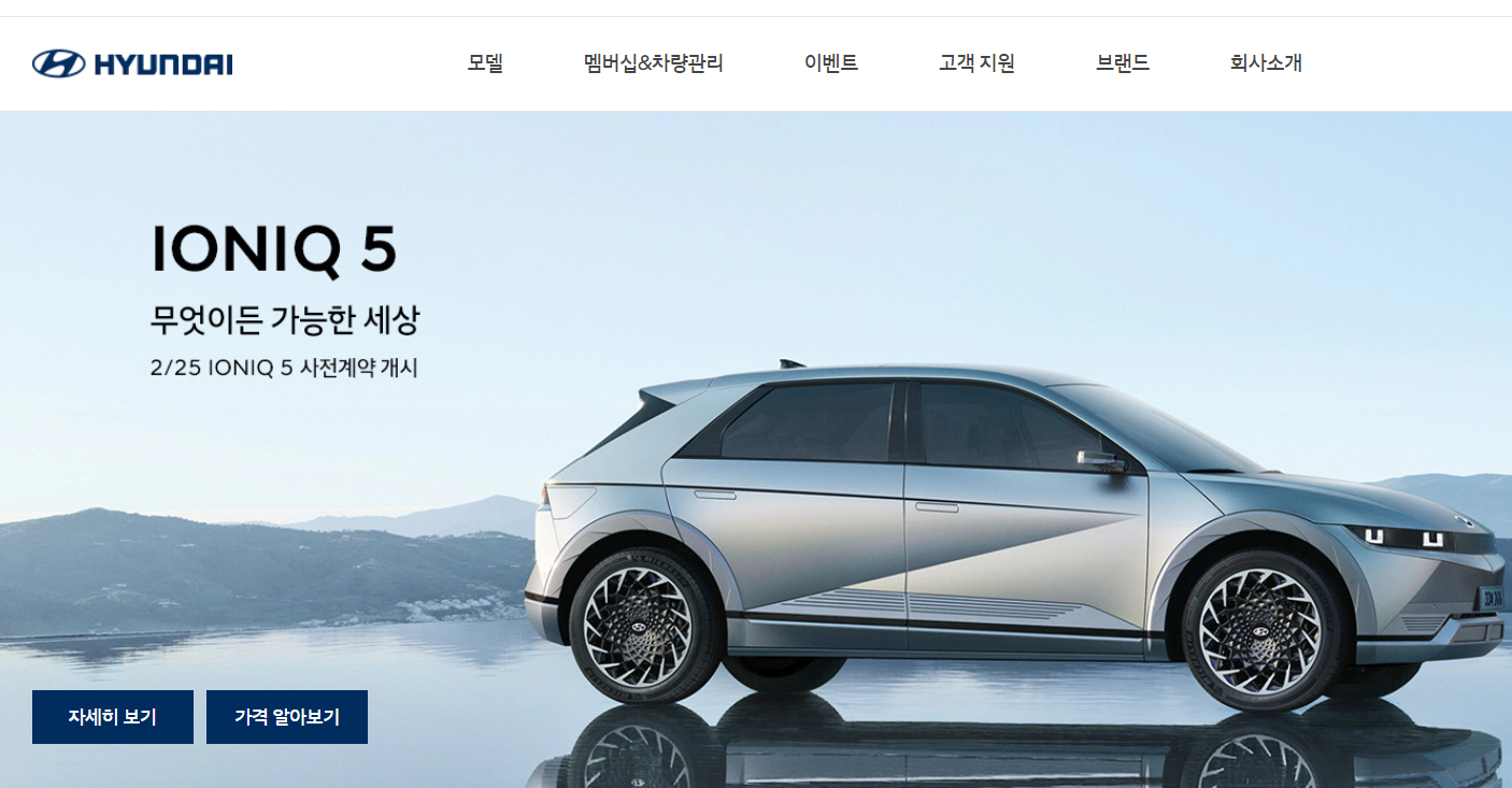 최근에 엄청 핫한 차가 있는데 아이오닉5라는 차량인데요. 그래서 그런지 웹페이지 메인에서 바로 해당 모델과 정보를 알려주는 바로가기가 있더군요. 참고해보시기 바랍니다.