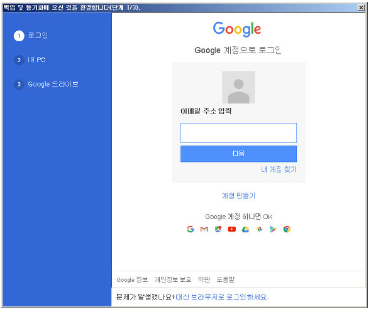 처음 프로그램을 실행하시면 위와 같이 시작하기라는 버튼이 등장합니다. 해당 버튼을 누르면 아래와 같이 구글 계정 로그인 창이 열리게 됩니다. 로그인해주세요.