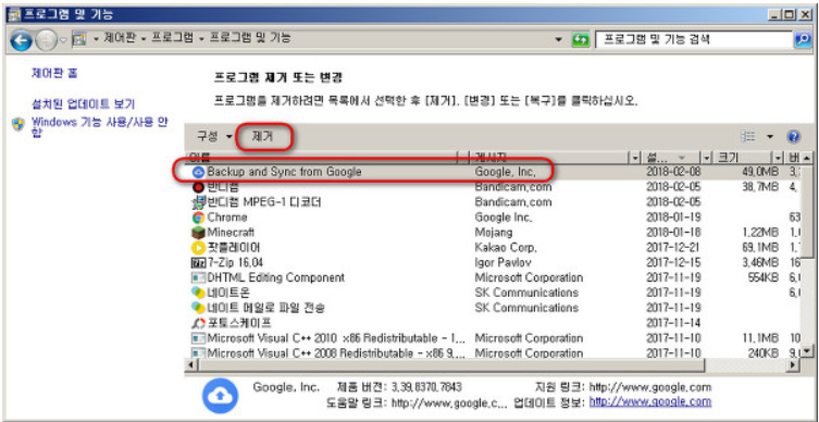 이상 구글 드라이브 다운로드 및 사용법을 알아보았습니다. 만약 프로그램을 삭제하고 싶으시다면 제어판 -> 프로그램 -> 프로그램 및 기능 을 선택하시고 "BackUp and Sync from Google을 제거 하시면 됩니다.