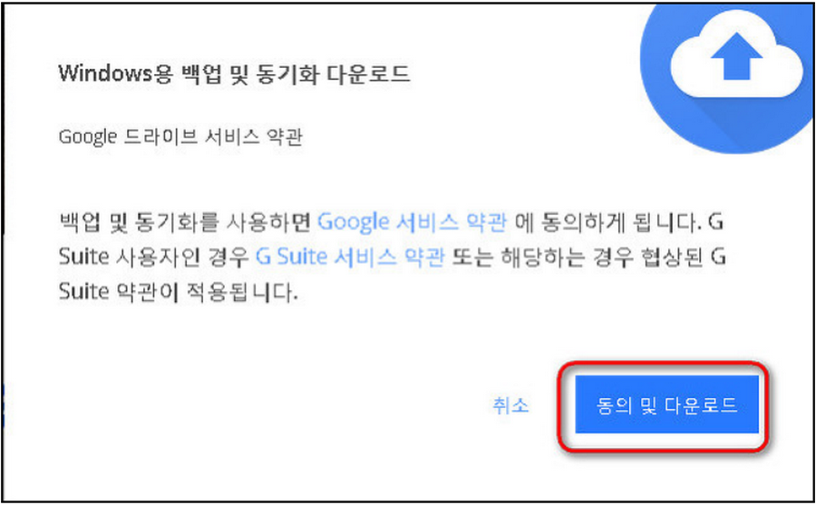 다운로드를 클릭하시면 아래와 같이 구글 드라이브 서비스 약관이 등장합니다. 동의 및 다운로드를 클릭하시면 설치파일을 바로 받을 수 있죠.