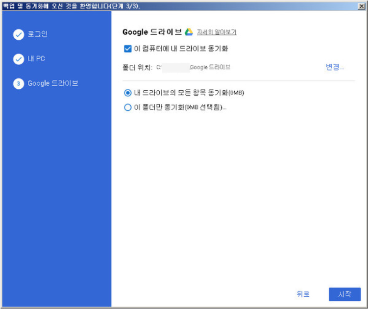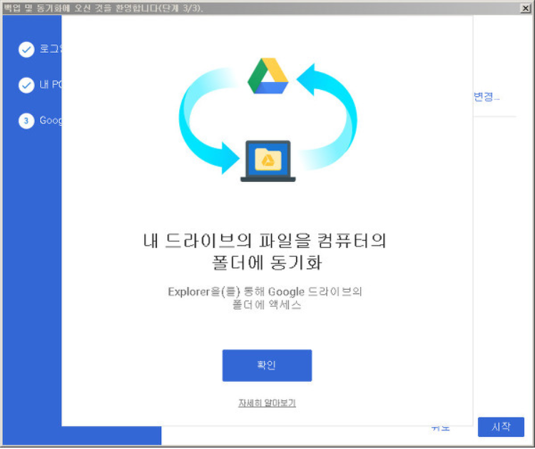 마지막 단계는 내 드라이브의 파일을 컴퓨터의 폴더에 동기화 시키는 설정이죠. 화면에 나타난 확인 버튼을 클릭해주세요.