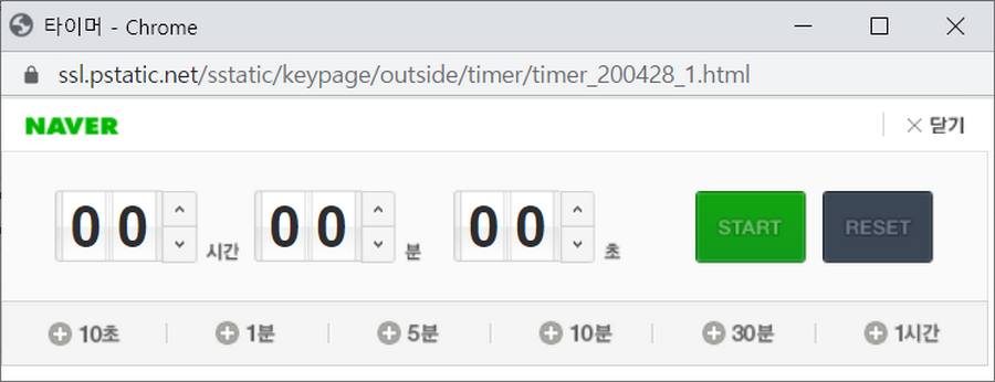 일단 네이버의 타이머를 이용하는 방법은 아주 간단합니다. 화면에 보이는 시간 / 분 / 초라는 부분을 설정하시면 되는데요. 적당하게 원하는 시간을 숫자로 입력하시거나 아니면 마우스로 올리거나 내리시면 되죠. 하단에 있는 10초나 1분, 5분, 10분 등등을 사용하셔도 됩니다.