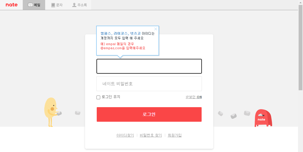 이전부터 사용하던 엠파스 계정이나 라이코스, 넷츠고 아이디를 여전히 사용하실수 있다고 하는데요. 여러분들이 기존에 가지고 있는것으로 들어가시면 되겠습니다.