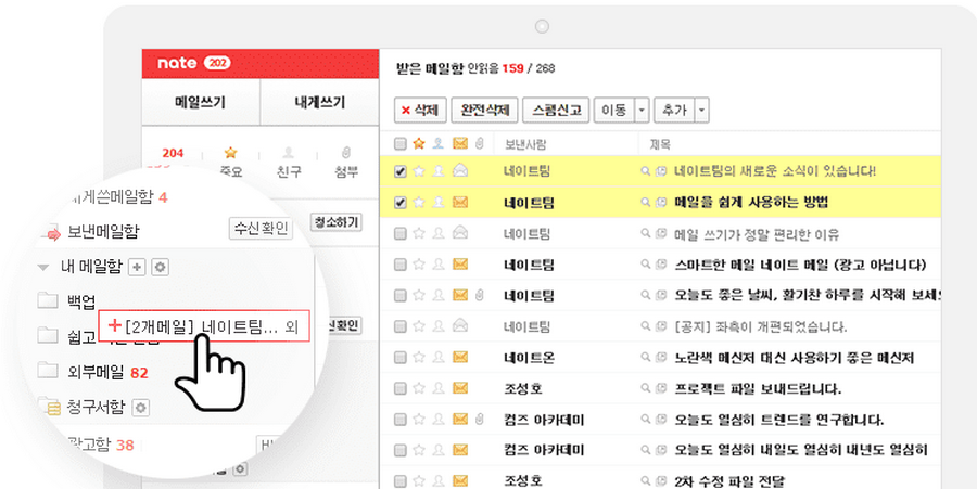 쉽고 빠른 편집 메일 선택 후 내 메일함으로 끌어당겨 보세요. 손쉽게 이동 및 삭제를 할 수 있습니다. 스마트한 우측 뷰 쓰기에서 자주 사용하는 메일주소를 저장할 수 있으며 편지함에서는 분