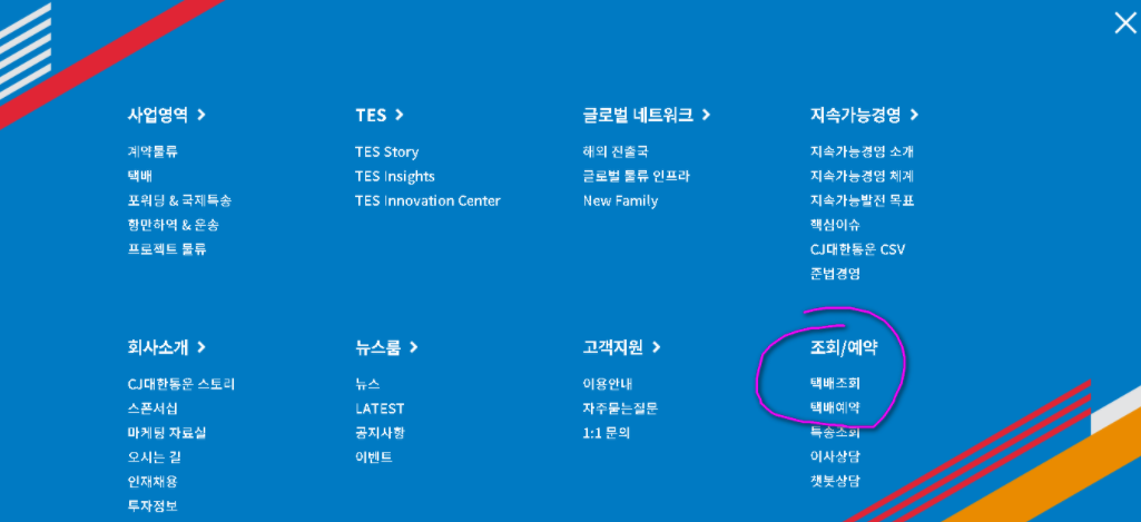우리가 이번에는 찾아 보고있는 cj대한통운의 택배조회 서비스는 홈페이지 오른쪽 상단에 있는 메뉴 전체보기를 이용하시면 됩니다. 사이트를 구성하고 있는 여러가지 메뉴를 알아볼수 있는 곳으로 조회 / 예약이라는 부분에 택배조회가 포함되어 있죠.
