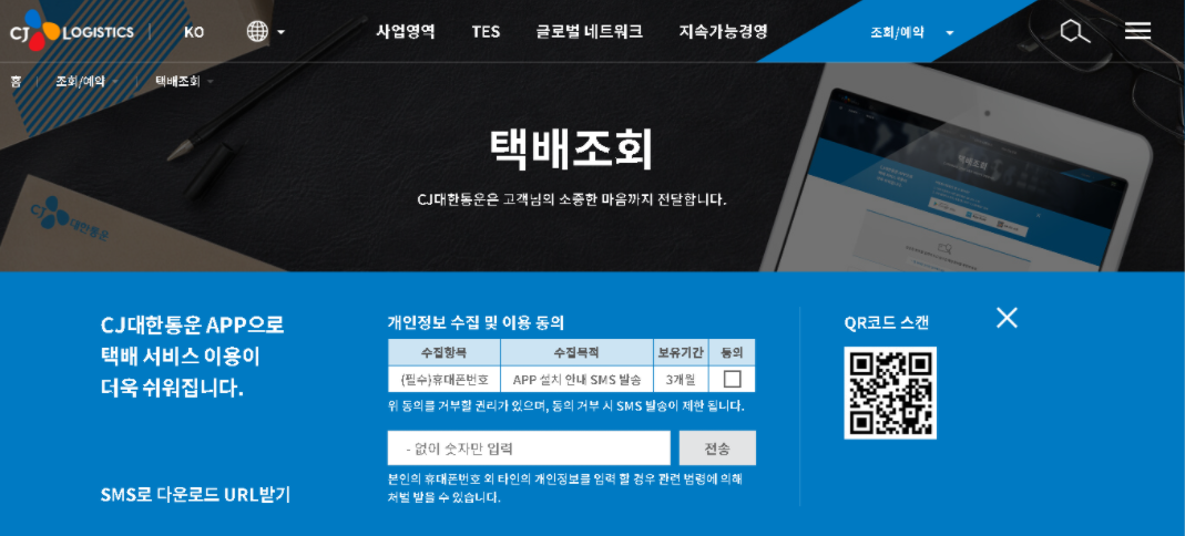 이렇게 여러분이 원하는 택배조회 항목에 들어갔습니다. 기본적으로 스마트폰을 사용하시는 분들이 많아서 그런지 cj대한통운에서는 모바일에서 사용가능한 APP을 별도로 제공하고 있죠. QR코드를 스캔해서 받으시거나 전화번호로 정보를 받으면 되겠죠.