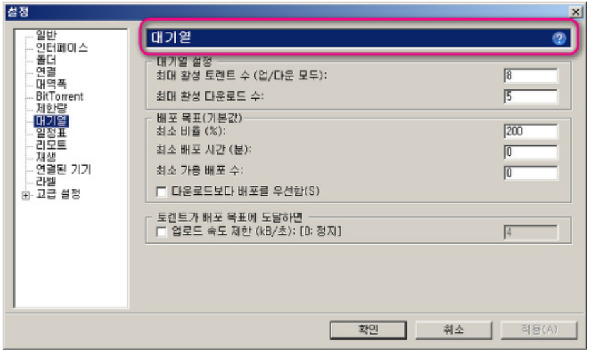 기본적으로 u 토렌트 프로그램에서 설정 -> 대기열항목과 대역폭등은 개인취향에 맞추어서 설정하시는 것이 좋습니다. 최대 동시 활성 토렌트 수(업/다운)를 조절하고나 업로드 속도를 제한할 수 도 있죠.