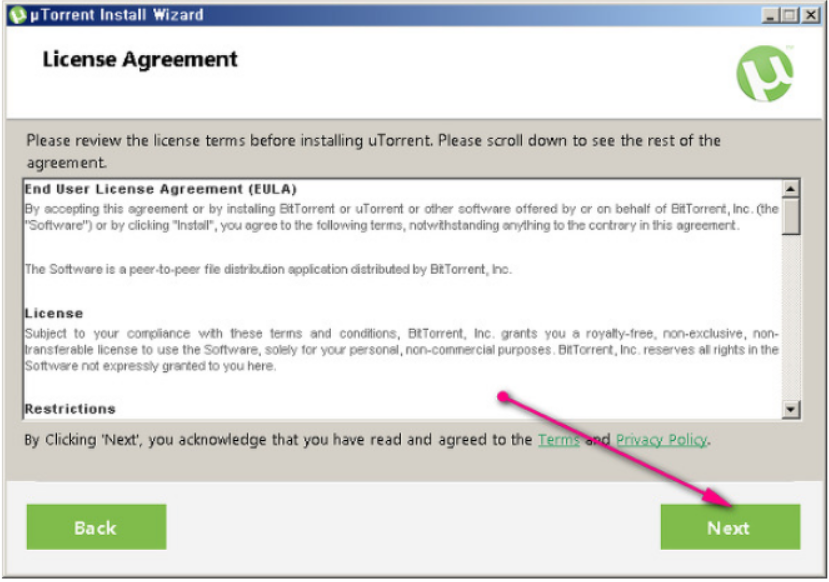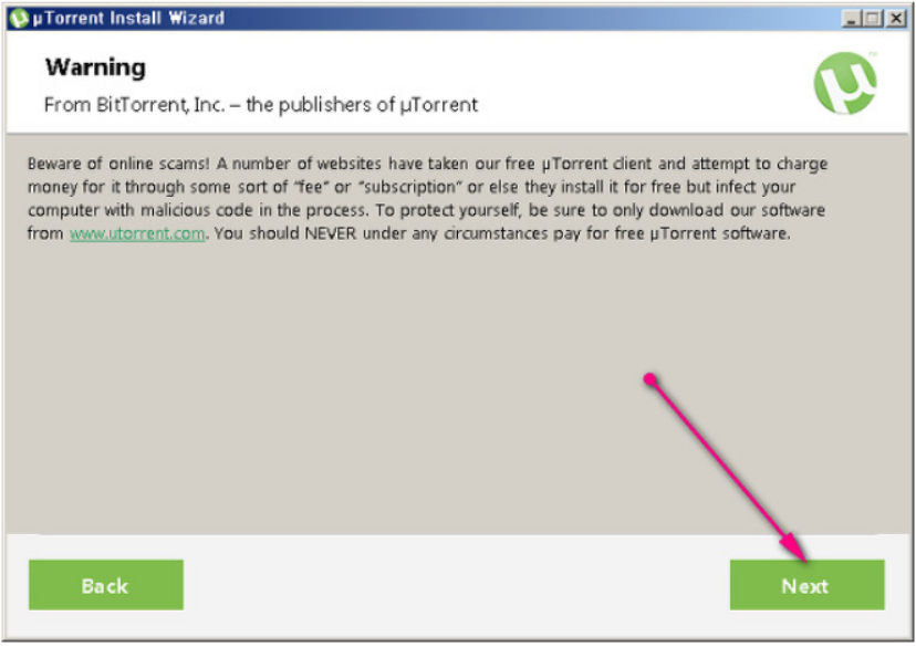 첫번째, 두번째 단계에서는 토렌트에 관한 간단히 내용을 읽어보시고 오른쪽 하단에 Next 버튼을 클릭하시면 토렌트설치가 진행 됩니다.