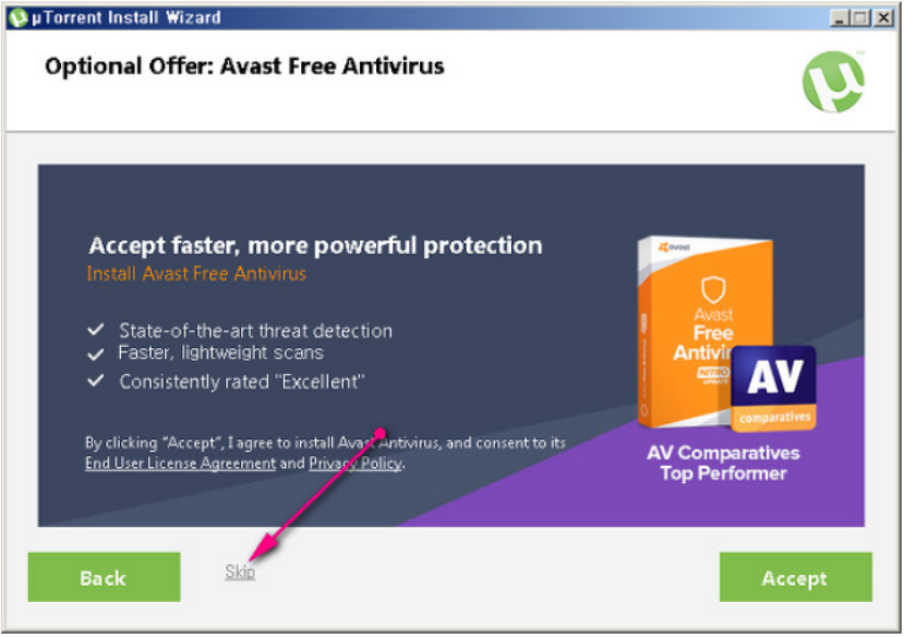 자 이제부터 집중하셔야합니다. 이번 단계는 토렌트 설치와 상관없는 백신프로그램설치 유도 단계인데요. 아무생각없이 오른쪽 버튼을 클릭하시면 토렌트와 어베스트 백신이 설치됩니다. 주의하시면서 왼쪽에 "Skip" 을 클릭해주세요.