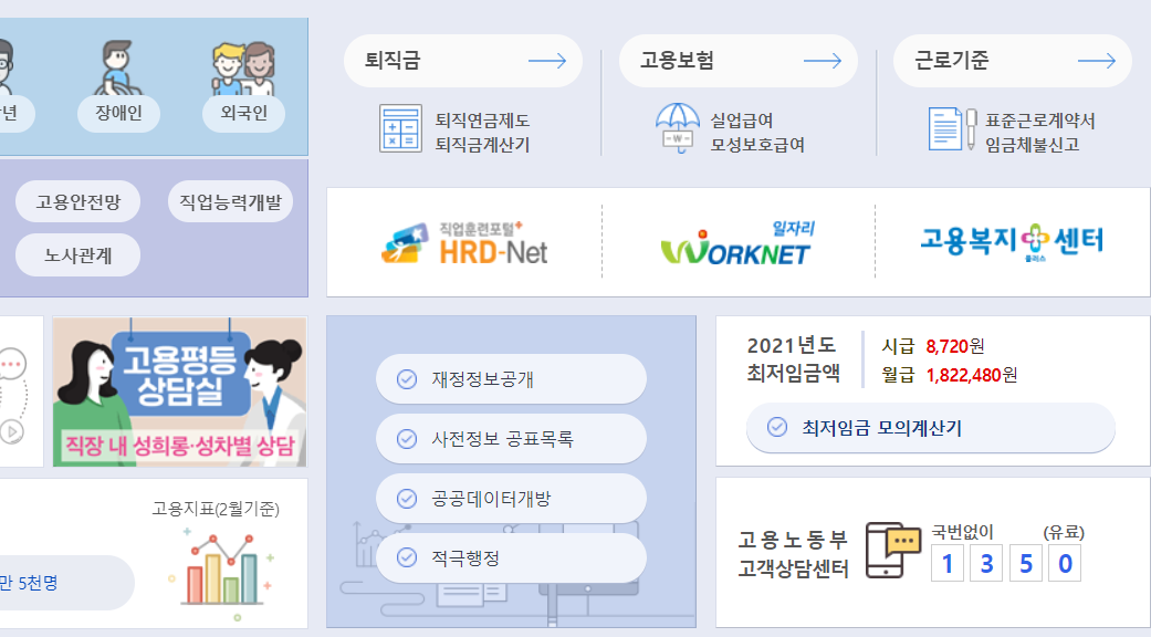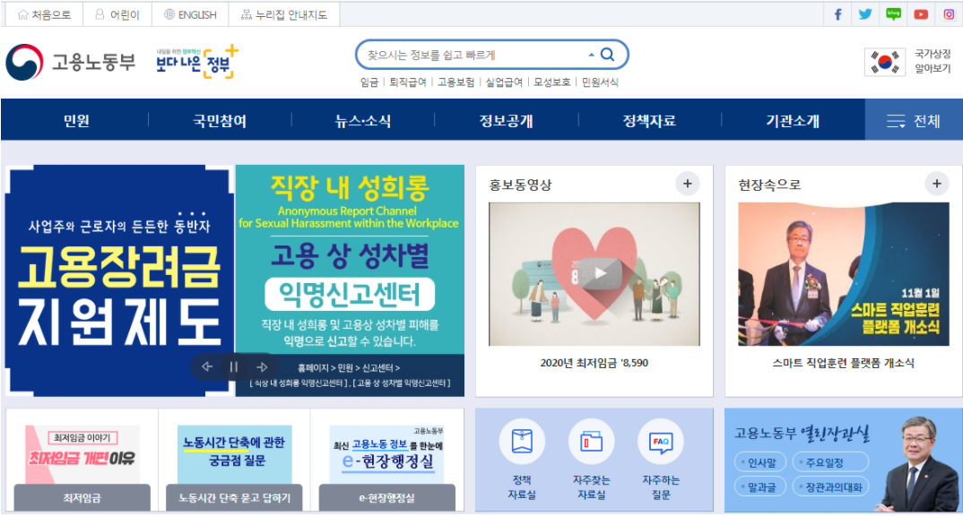 인터넷에서 고용노동부에서 운영하는 홈페이지를 찾아서 접속해보시면 아래와 같은 화면이 등장합니다. 이곳을 보시면 고용장려금제도나 최저임금에 대한 이야기도 찾아볼 수 잇죠. 최신 정보를 확인하기 가장 좋은곳이랍니다.