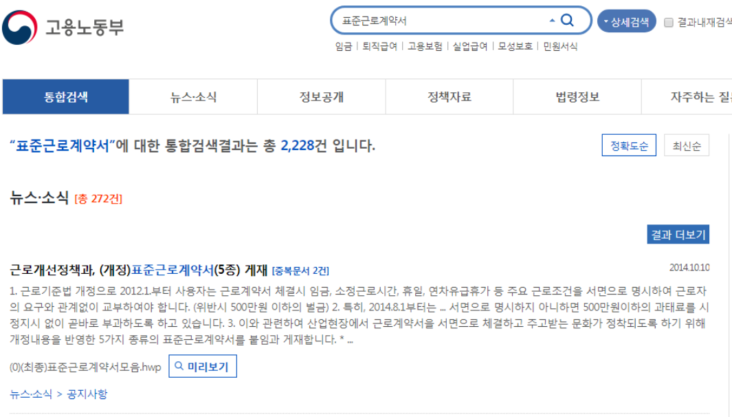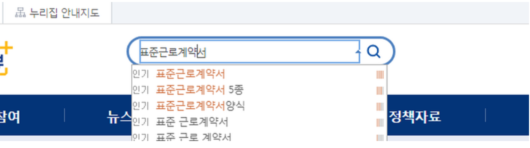 일단 홈페이지에서 우리가 원하는 표준근로계약서 양식을 찾아야하는데요. 그냥 보이는 화면에서는 메뉴도 많아서 잘 안보이더군요. 그럴때는 고용노동부 사이트 중앙에 있는 검색 기능을 이용하시면 쉽게 확인이 가능합니다.