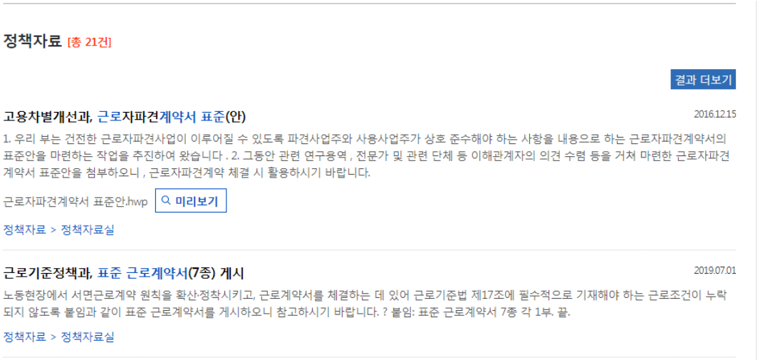 다시 검색 결과 화면으로 돌아가셔서 스크롤 바를 하단으로 이동해주세요. 그럼 정책자료라는 항목이 보이죠. 여기에서 잘 보시면 근로기준정책과, 표준근로예약서 7종 게시라고 쓰여있는 2019년 7월 글이 보이실 꺼에요.