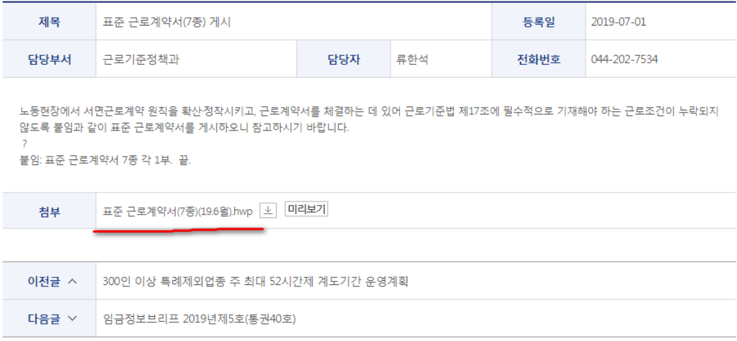 해당 게시물을 선택하시고 들어가보시면 간략한 내용 설명이 나와있고 하단부분을 봐야합니다. 거기 첨부라는 항목에서 표준근로계약서 양식 무료 다운을 받을 수 있죠. 2019년 6월 버전이라는 것 같더군요.