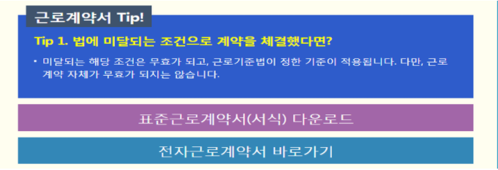 근로계약서 Tip! Tip 1. 법에 미달되는 조건으로 계약을 체결했다면? 미달되는 해당 조건은 무효가 되고, 근로기준법이 정한 기준이 적용됩니다. 다만, 근로계약 자체가 무효가 되지는 않습니다.