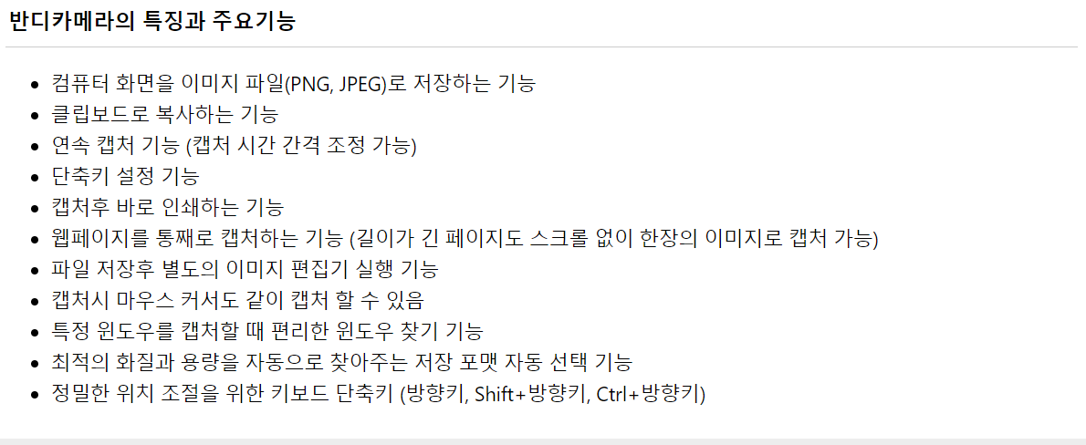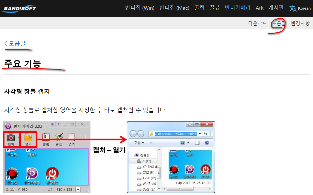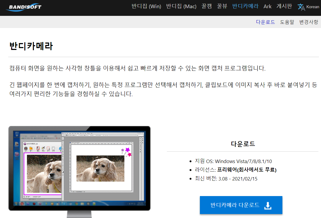 반디카메라는 프리웨어 제공으로 유명한 반디소프트에서 제공하고 있죠. 이곳에서는 반디집과 같은 유명프로그램을 가지고 있죠. 간단하게 프로그램 기능을 펴보시기 위해서는 공식 홈페이지를 참고하시면 됩니다.