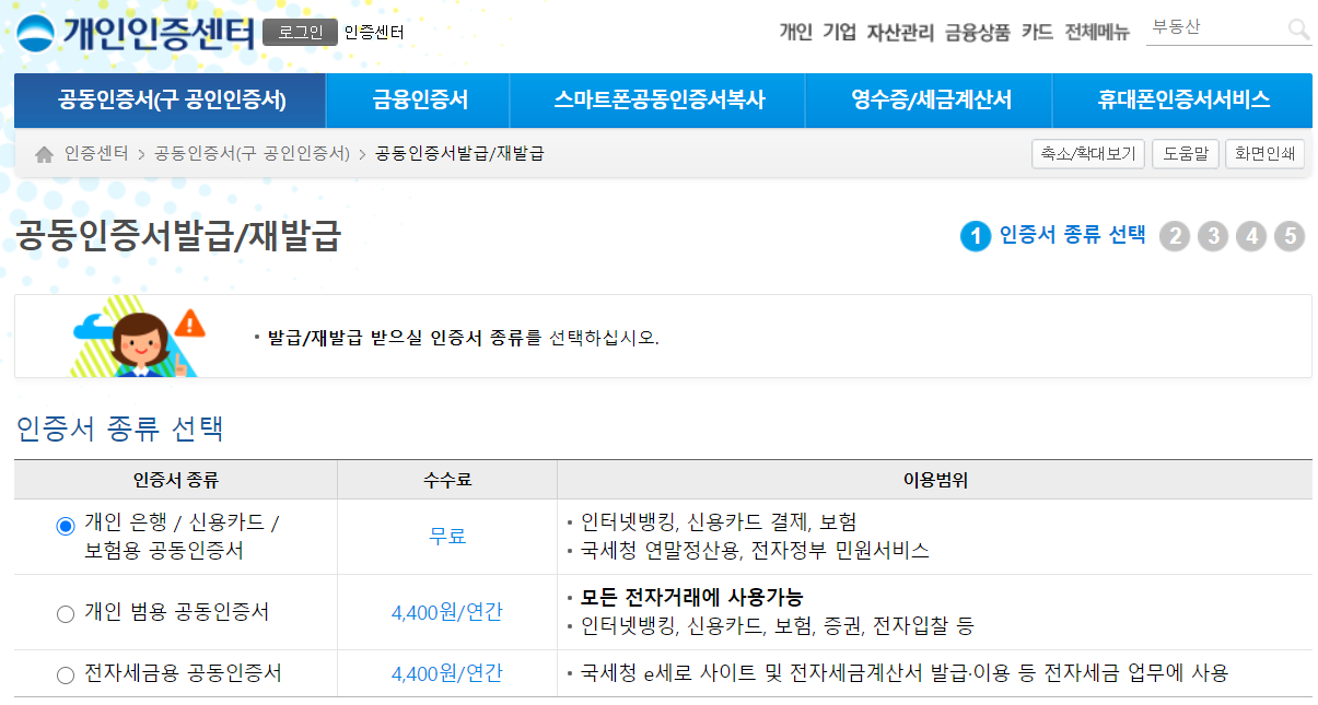 개인분들이야 은행업무용으로 사용하는 것은 별도의 수수료없이 공동인증서를 발급 받을수 있는데요. 범용이나 전자세금용같은 경우에는 1년을 기준으로 4400원에 이용이 가능하다고 합니다.