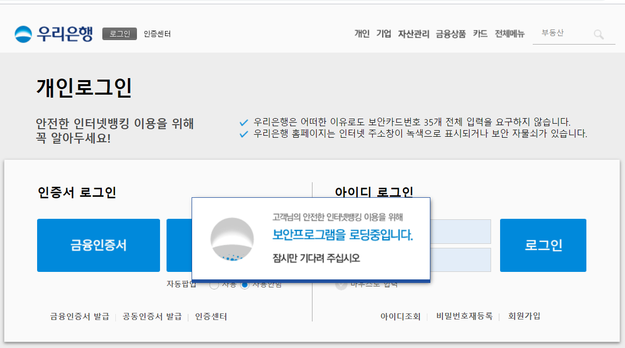 기본적인 보안프로그램을 설치하시고 나면 바로 우리은행 인터넷뱅킹을 사용하실수 있으니 안전에 유의하시면서 사용하시기 바랍니다. 그럼 오늘도 행복한 시간보내시기 바랍니다.