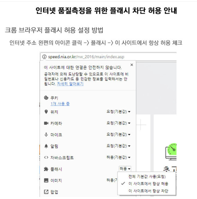 설치 후 정상적으로 측정이 되지않는다면 아래 항목을 확인해주세요. 크롬 브라우저 플래시 허용 설정 방법 확인방법을 확인해보겠습니다.